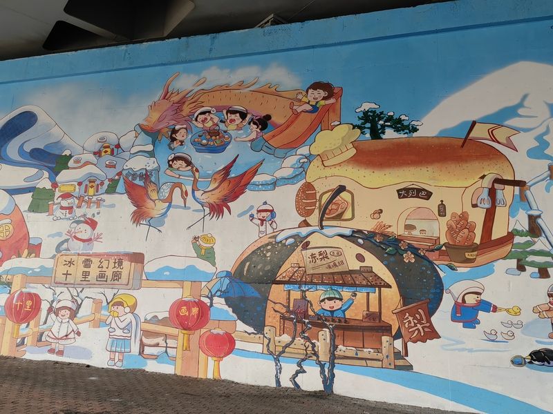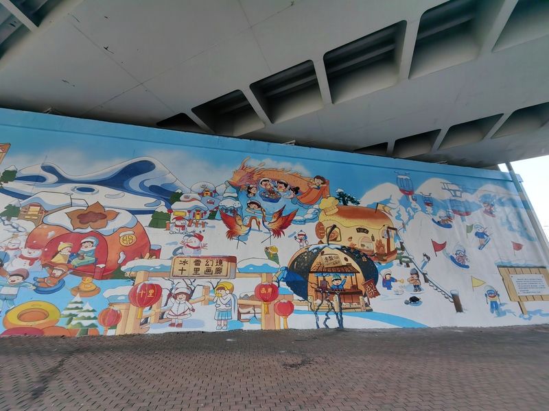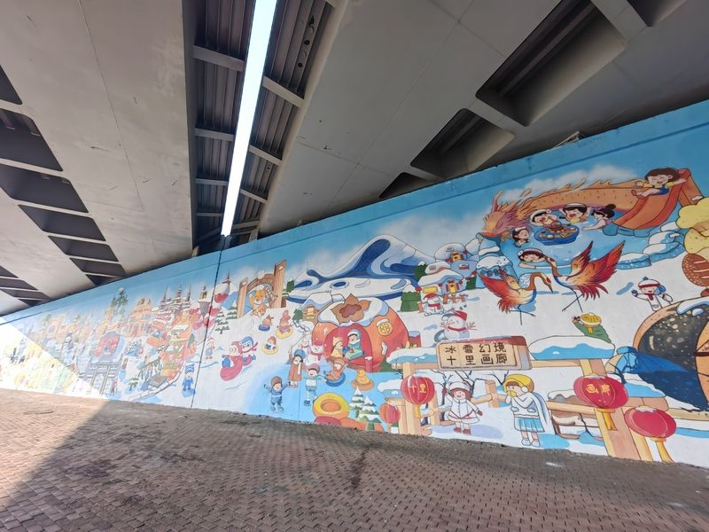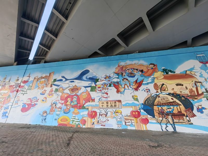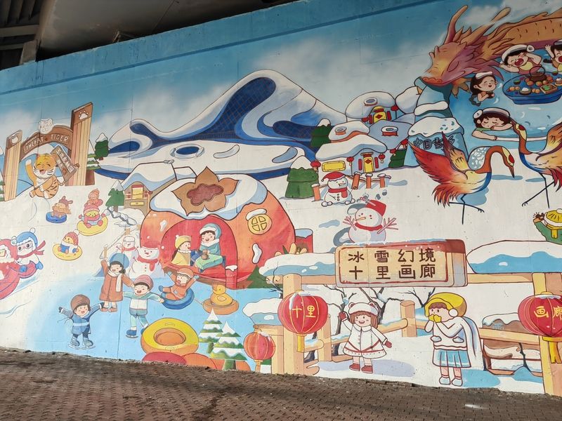 2024年11月11日,哈爾濱火車站北廣場(chǎng)附近,近54米長(zhǎng)、7.5米高的亞冬主題彩繪墻已制作完成,成為一處新的打卡景點(diǎn),吸引許多游客、市民駐足觀看、拍照。