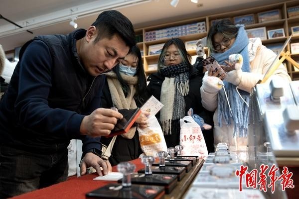 1月15日,黑龍江哈爾濱,中華巴洛克歷史文化街區(qū),薛以恒沙畫(huà)創(chuàng)意設(shè)計(jì)中心,主理人薛以恒(左一)正忙著給來(lái)哈爾濱旅游的北京城市學(xué)院大學(xué)生們加蓋紀(jì)念章,這些紀(jì)念章融入了哈爾濱的冰城地標(biāo)建筑元素,以“祥龍納福”為主題。中青報(bào)·中青網(wǎng)記者 程璨/攝