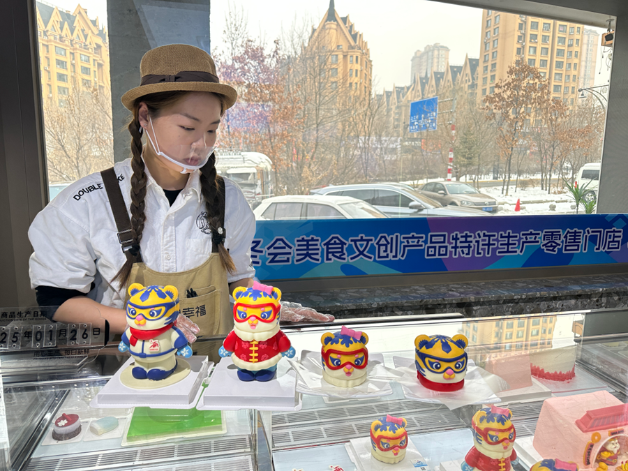 1月26日,在哈爾濱一家甜品店,店員展示亞冬會吉祥物造型的蛋糕。新華網(wǎng) 邱虹攝
