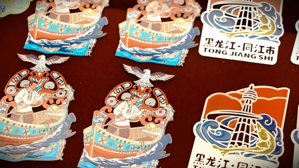 除了魚皮手工藝品,印著同江特色風景的冰箱貼、書簽、水杯等文創(chuàng)產(chǎn)品也成了游客們的“心頭好”,在各大景區(qū)的文創(chuàng)商店里時常被搶購一空。